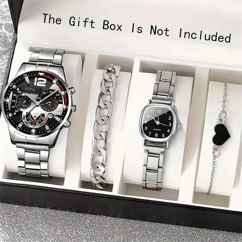 4 Piece Quartz Watch Set For Couples Black And White Fashionable matel chain Watch Gift Watch Bracelet Accessories -